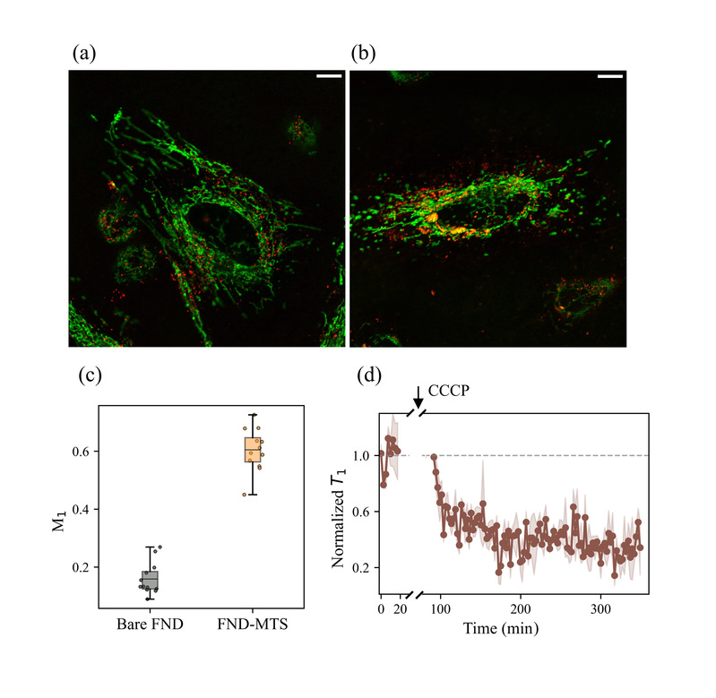 图1:荧光纳米金刚石靶向线粒体并监测氧化应激。(a)未修饰FND(红色)与线粒体(绿色)共定位程度低;(b)线粒体靶向修饰后的FND与线粒体显著共定位;(c)定量分析证实靶向修饰显著提升线粒体富集效率;(d)加入药物后,T1弛豫时间下降,实时反映线粒体内自由基水平升高。