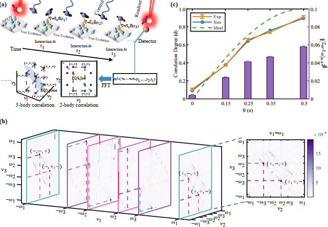 图 1: (a)方法概念图。(b)三体关联的重构。(c)通过关联累积量可视化量子纠缠的建立过程。