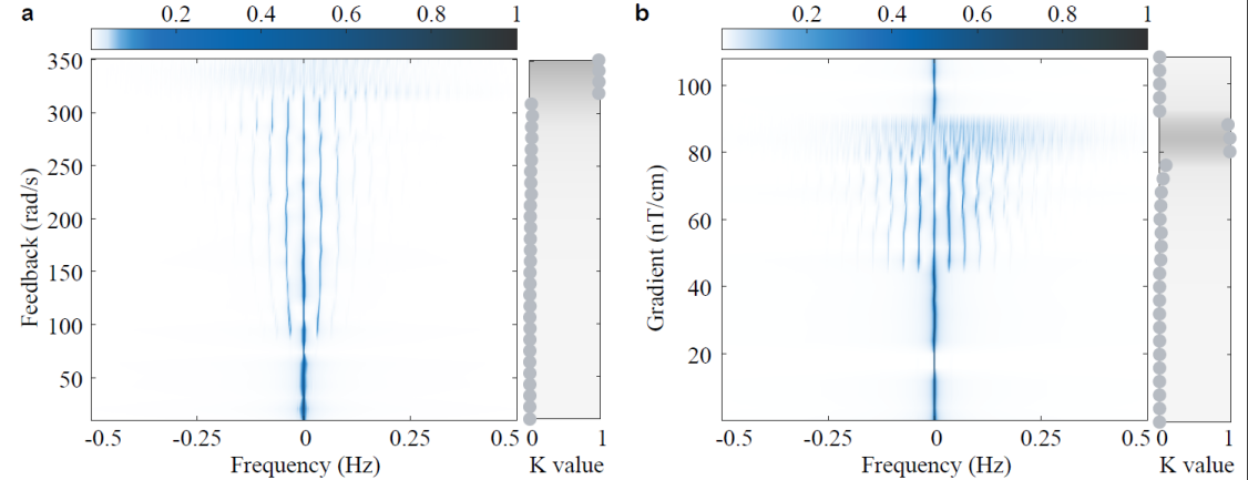 图2. a, 时间晶体随反馈强度变化相图;b, 时间晶体随磁场梯度变化相图。