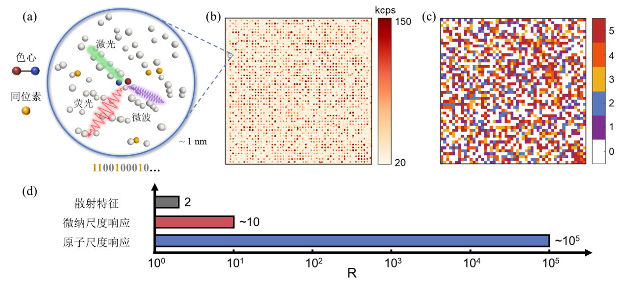 针对上述难题,研究团队创新性地提出利用材料内部原子尺度的本征随机性,在固体内部构建三维分布的原子级物理不可克隆函数。固体中的杂质、空位缺陷和同位素等原子级特征,共同构成了复杂且随机的原子构型。以在科研与工业领域广泛使用的金刚石为例,团队结合NV色心制备的随机性与材料固有的碳-13同位素分布随机性,引入量子精密测量技术,提取出具备高熵值的光学和自旋响应机制。在1纳米的特征尺度下,该原子构型的香农熵高达17.49,远超传统物理不可克隆函数单个像素的典型熵值范围(1-3)。由于复制该原子构型需要单原子水平的物质构筑能力,这远超现有微纳加工技术的极限,从而从物理本质上确保了其不可克隆的安全性。进一步地,团队结合高精度色心制备技术,实现了该原子级物理不可克隆函数标签的批量制备,展示了其编码空间的可拓展性。